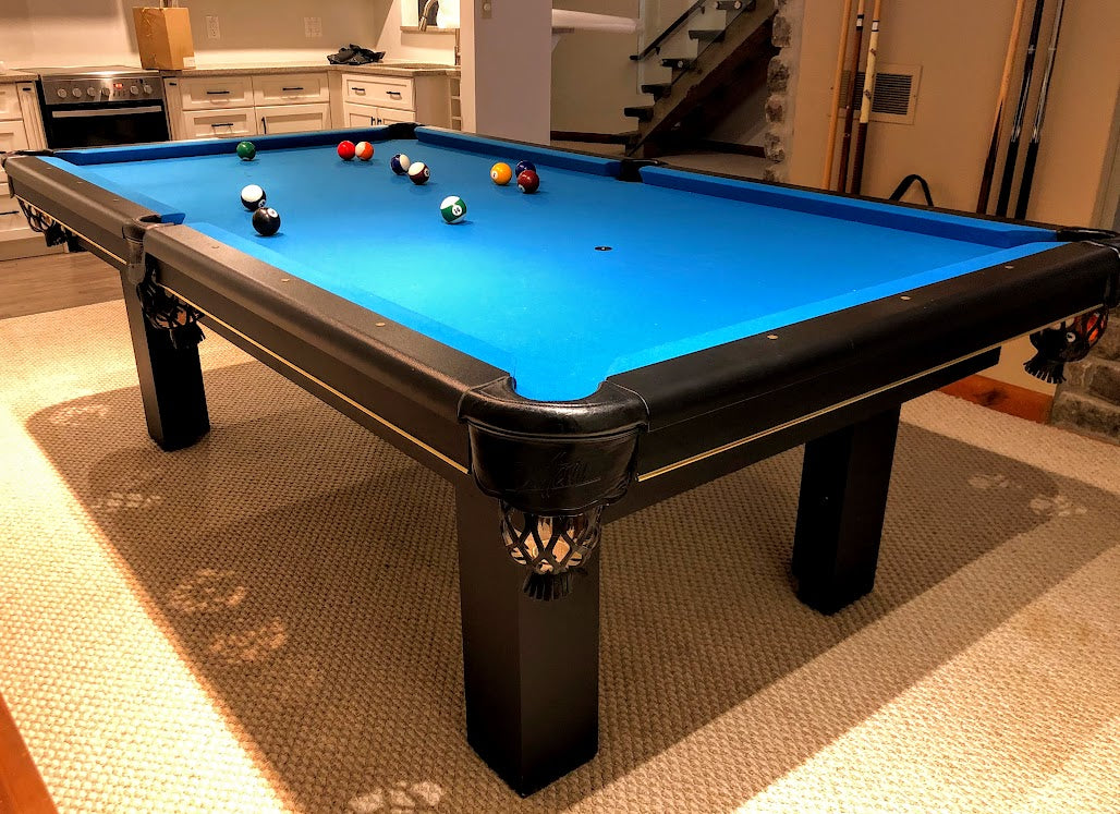 8' PREOWNED DUFFERIN LEGEND SLATE POOLTABLE INSTALLED WITH ACCESSORIES BLACK FINISH