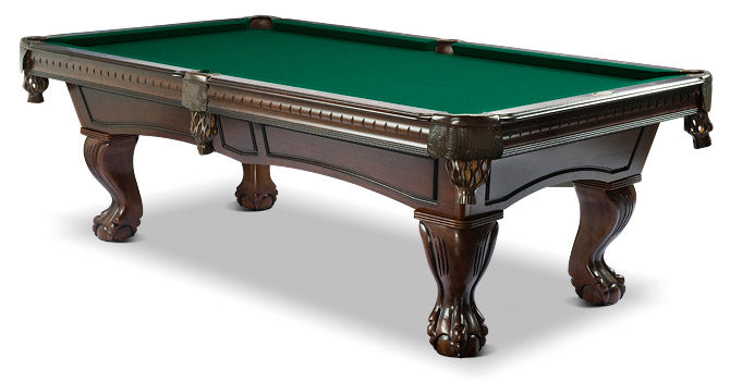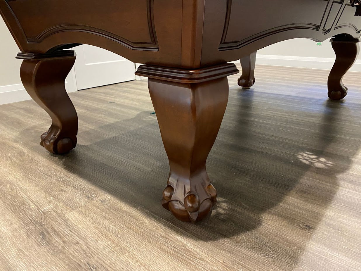 Crafted with meticulous attention to detail, the Pinnacle Walnut features genuine leather pockets that exude opulence, backed by a solid wood frame with four intricately hand-carved ball-in-claw legs. The table's 1-inch thick natural quarried slate ensures exceptional playability, while its European and North American solid wood construction guarantees durability and longevity.
