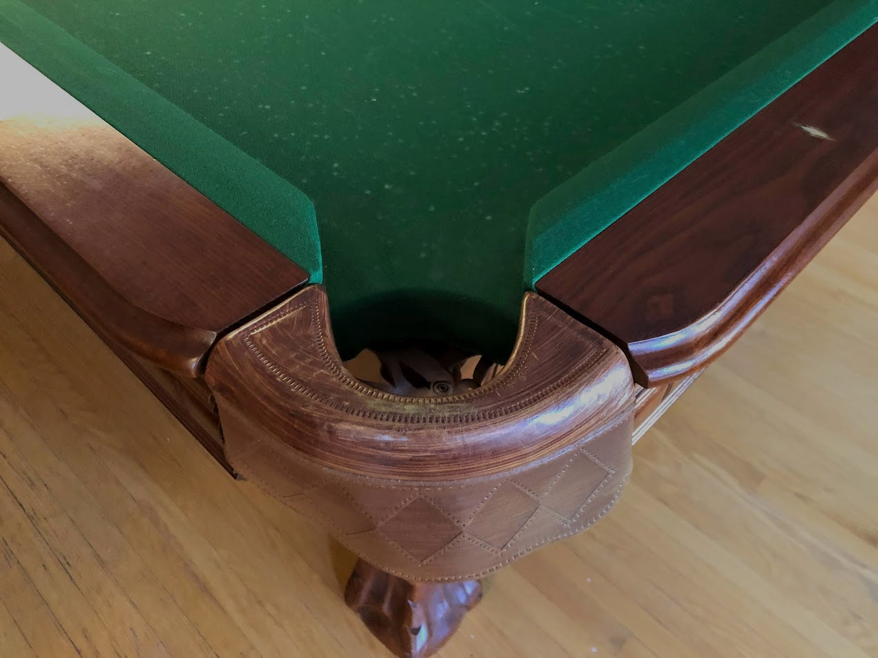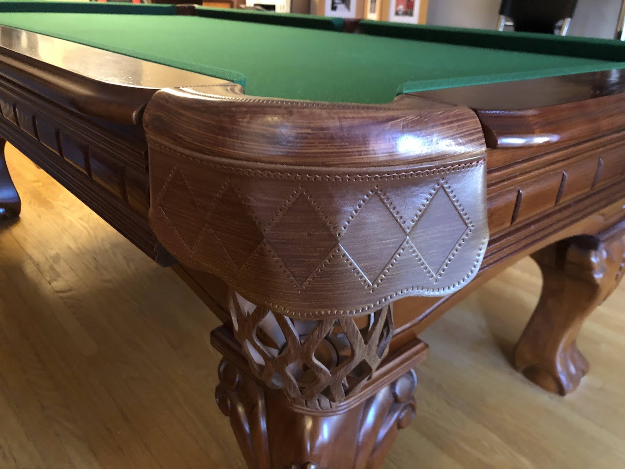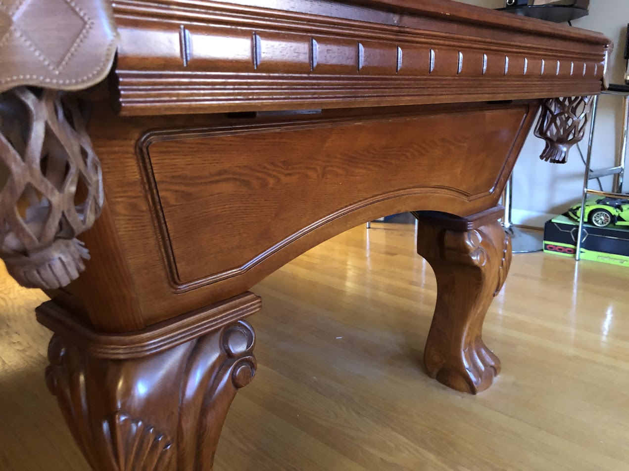 Exceptional quality pre-owned billiard table featuring authentic slate playing surface and solid wood construction. This professional-grade pool table is ready to transform your game room.